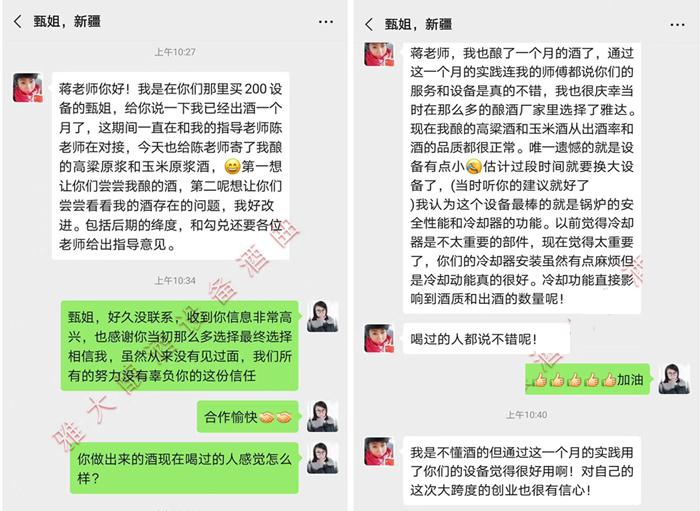 5月10日甄姐收到設(shè)備并開始安裝,1個月后發(fā)酵的第一鍋高粱酒發(fā)酵完成,這期間雅大售后陳老師一直與甄姐保持聯(lián)系,從泡糧、蒸糧、下曲、發(fā)酵每個過程都一對一視頻指導(dǎo)。