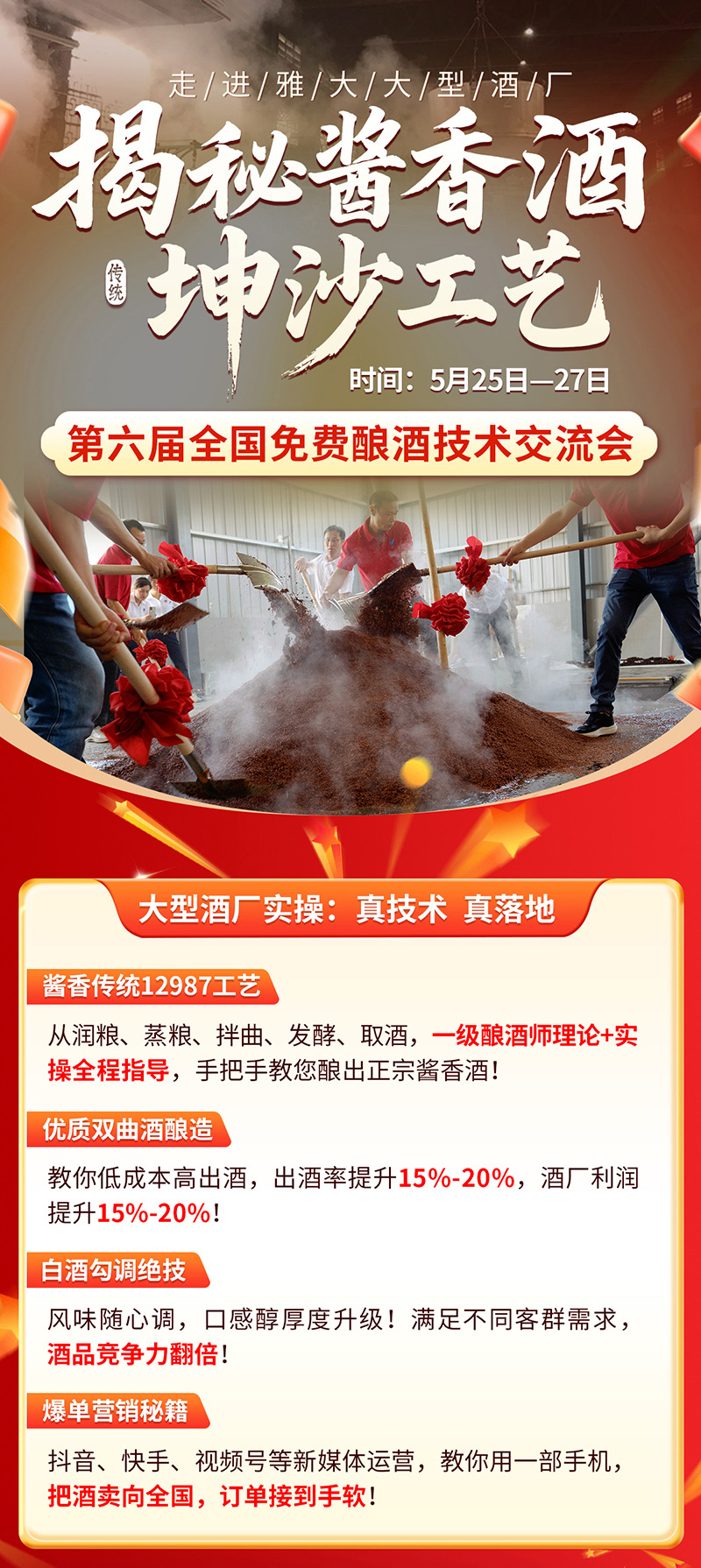國匠級(jí)導(dǎo)師團(tuán)坐鎮(zhèn),3000斤醬香坤沙工藝現(xiàn)場(chǎng)實(shí)操,手把手教你熟練掌握醬酒工藝,提升酒坊競(jìng)爭(zhēng)力!